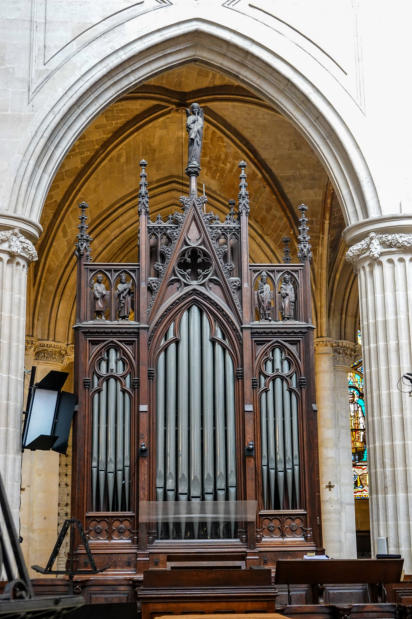 E6Construit par le facteur John Abbey en 1838, c’était à l’origine un instrument composé de 2 claviers et 8 jeux et d’un pédalier en tirasse sur 18 notes. Le buffet néo-gothique a été réalisé par le menuisier Boileau.En 1900, la maison Merklin le transforme et le porte à 12 jeux. En 1961, Jean Hermann a modifié la composition (ajout Sesquialtera II et PLein-Jeu III).Entre 1976 et 1980, réharmonisation complète par le facteur Maciet (problament l’ajout Larigor 1 1/3 et Sifflet 1).En 1995, le facteur Bernard Dargassies a restauré l’orgue et modifié de nouveau la composition. L’ancienne Sesquialtera II du GO est montée au Récit en deux jeux indépendants pour faire place à une Trompette 8’. Le Récit modifié a retrouvé sa disposition d’origine. Seulement la Montre et peut-être le Prestant sont d’Abbey, réharmonisées. Le reste de la tuyauterie est de Merklin et Hermann.