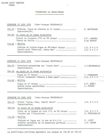C11776-1781Le grandiose projet d’un nouvel orgue de Saint-Sulpice commença à prendre forme en 1776. Deux projets de buffet sont présentés : le premier, de l’architecte Laurent, où il n’y avait pas de tuyaux apparents - une nouvelle mode - et le second, un dessin de Jean-François Chalgrin. Les marguilliers optèrent pour le deuxième projet car, selon eux, il s’harmonisait mieux avec la vaste tribune de pierre bâtie sur les plans de Servandoni. Le 1er janvier 1778, un contrat fut signé avec le maître-menuisier Jadot (20,000 livres) et le sculpteur Duret (16,000 livres) pour la réalisation du buffet. Quant à l’orgue, le devis a été préparé par François-Henri Clicquot et révisé par Dom François Bédos tandis que le contrat fut signé, le 1er janvier 1780, pour la somme de 40,000 livres.L’orgue fut complété par Clicquot le 30 avril 1781. Les arbitres désignés pour la réception furent les trois organistes de Notre-Dame, Armand-Louis Couperin, Claude Balbastre et Nicolas Séjan, assistés de Jean-Jacques Charpentier. Dom Bédos qui s’était intéressé avec tant d’ardeur à la construction du monumental instrument, était mort depuis deux ans. La réception officielle eut lieu le 15 mai 1781 et, devant l’intérêt manifesté par le public, une seconde audition eut lieu le lendemain.L’orgue de Clicquot comptait 64 jeux, 5 claviers, un pédalier de 36 notes et 4,328 tuyaux alimentés par quatorze soufflets.Pendant la Révolution, le chef d’œuvre de Clicquot fut heureusement préservé, résonnant triomphalement à maintes reprises. 1834-1845Restauration de l'instrument commencée par Louis Callinet en 1834. Ce facteur d'orgues est en proie à des difficultés financières et abandonne le chantier en 1838. La restauration de l'orgue est confiée aux établissements Daublaine et Callinet. Ces derniers n'achèvent pas les travaux et c'est finalement le facteur d'orgues Pierre-Alexandre Ducroquet qui terminera le travail de restauration. •suppression de plusieurs rangs de pleins jeux •ajouts de jeux d'anches •ajout d'une machine Barker. L'orgue restauré est réceptionné en avril 1846. Il comporte 65 jeux. 1855-1863Suite à cette restauration, ni la paroisse ni l’organiste n’étaient satisfaits de l’instrument. En 1855, ils embauchèrent Aristide Cavaillé-Coll pour assurer l’harmonisation et l’entretien de l’instrument. Presque immédiatement, Cavaillé-Coll prépara un projet pour une reconstruction complète de l’instrument en réutilisant le matériel existant.Après cinq années de travaux, Cavaillé-Coll livra, dans le buffet de Chalgrin, un instrument de 100 jeux , répartis sur pas moins de 7 étages. La magnifique console en terrasse apporte une grande innovation qui consiste à confier le tirage des jeux aux machines Barker. Cette innovation permet, entre autres, de mémoriser une registration en plus des jeux préparés avec le système des doubles layes. De l’orgue de Clicquot, il conserve environ 40 rangs de tuyaux, incluant les mixtures et les anches. Ceci représente environ les 2/3 de l’instrument original. Il a aussi conservé 7 sommiers mais les a transformés pour y inclure une deuxième série de soupapes afin d’optimiser l’alimentation de vent. De Callinet, il conserve la Trompette en chamade, quelques bassons et des rangs d’anches. Il conserve aussi la machine Barker qu’il installe au Récit.Toute la mécanique a été reconstruite de même que les systèmes de ventilation et d’alimentation d’air. Ces derniers sont équipés de différentes pressions d’air pour les sons graves et aigus de chaque rang pour le même jeu en plus de posséder des pressions plus élevées pour les anches que pour les jeux de fonds. Chaque division possède sa propre machine Barker alors qu’une machine générale est chargée des accouplements. Le grand orgue est distribué sur sept étages, depuis le sol de la tribune jusqu’à la voûte, sur une hauteur de 18 mètres (59 pi). Quatre étages sont occupés par le mécanisme et les trois autres par les tuyaux.L’inauguration de cet orgue monumental eut lieu le 29 avril 1863 avec la participation de César Franck, Camille Saint-Saëns, Alexandre Guilmant, Auguste Bazille et l’organiste titulaire, Georges Schmitt. En 1863, l’ajout d’une pédale d'orage, un rossignol et la machine à grêle à la demande de Lefébure-Wély.1883Le premier nettoyage fut effectué par Cavaillé-Coll lui-même et quelques modifications mineures furent apportées principalement afin d’assurer un meilleur apport de vent aux notes graves du Récit.1903Charles Mutin entreprit une restauration majeure de l’instrument et apporta des modifications à la demande de Widor: •de petites modifications dans la composition de l'instrument: la Clarinette du Positif fut remplacée par un Baryton 8’ et l’Euphone 8’ du même clavier par un Basson 16’. Trois nouveaux jeux furent introduits par échange : un Diapason 8’ au Récit, une Septième 2 2/7’ et une Trompette en chamade 8’ au clavier de Solo.•l'ordre des claviers à la console est changé. Si le I Grand Choeur et II Grand-Orgue restent à la même place, la division de Bombarde, placée sur le IIIème clavier est déplacée au Vème clavier et prend le nom de Solo. La division du Récit, jusque là sur le Vème clavier est transférée au IVème clavier. Enfin, la division de Positif, parlant initialement sur le IVème clavier est déplacée sur le IIIème clavier.1933La seule critique de Widor était que la division de la Pédale restait trop faible avec seulement 12 jeux. Pour marquer sa retraite, en 1933, la paroisse lui a offert deux jeux additionnels pour la Pédale soit un Principal 16’ et 8’ installés, par Pleyel-Cavaillé-Coll, à l’extérieur du buffet sur des sommiers pneumatiques à boursettes.1988-1991Jean Renaud effectua un grand dépoussiérage de l’instrument, dans le respect le plus complet de s